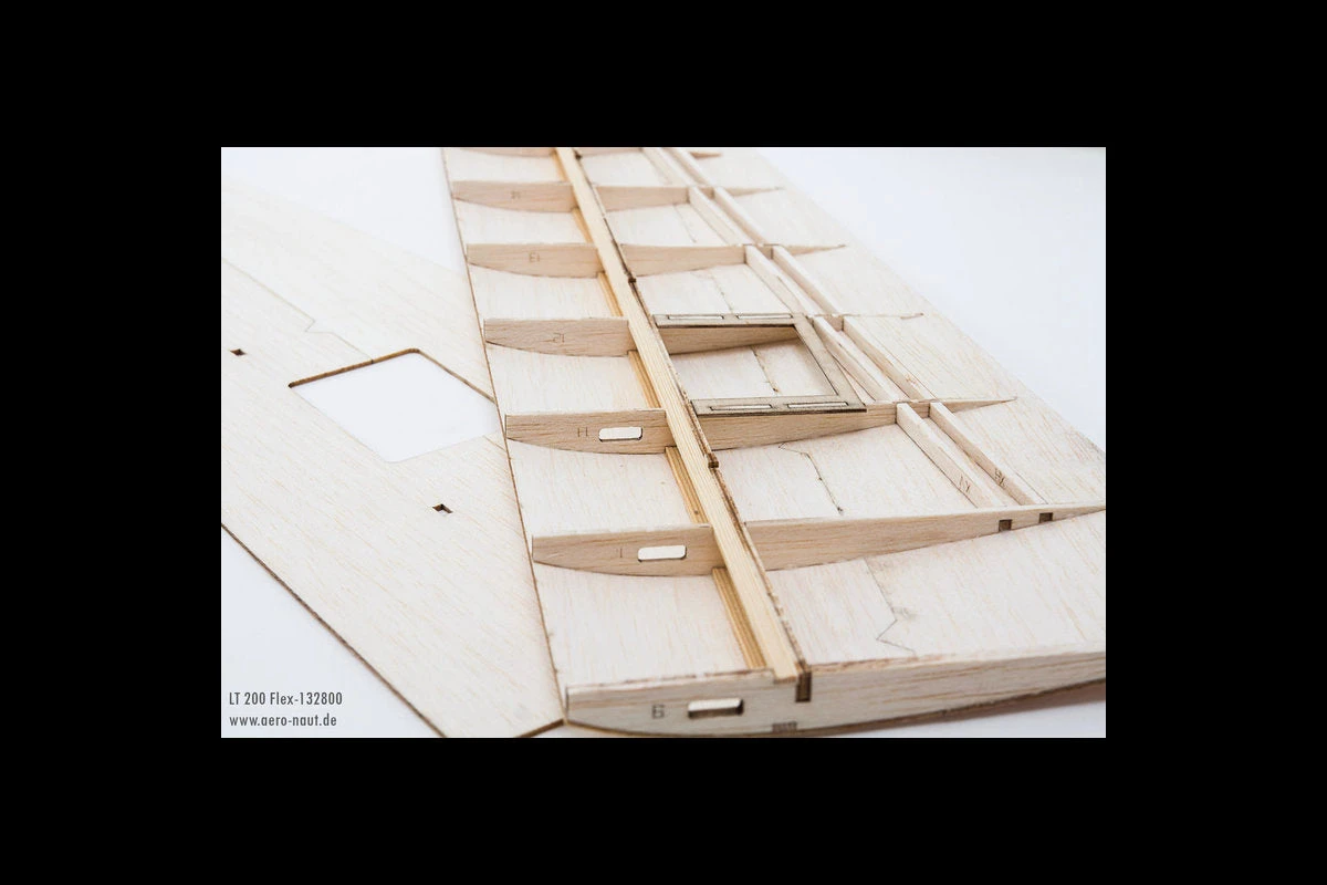 The kit is built up from balsa with the exception of the boom which is carbon composite. The fuselage pod is built up in layers and sanded to shape. The wings are built on the included jig and are a traditional balsa rib / spruce spar construction with fully sheeted wings. With the wings being fully sheeted you have the option to Not to use covering film to save weight, although we would recommend using at least one coat of water based polyurethane or similar to seal the wood from moisture.
