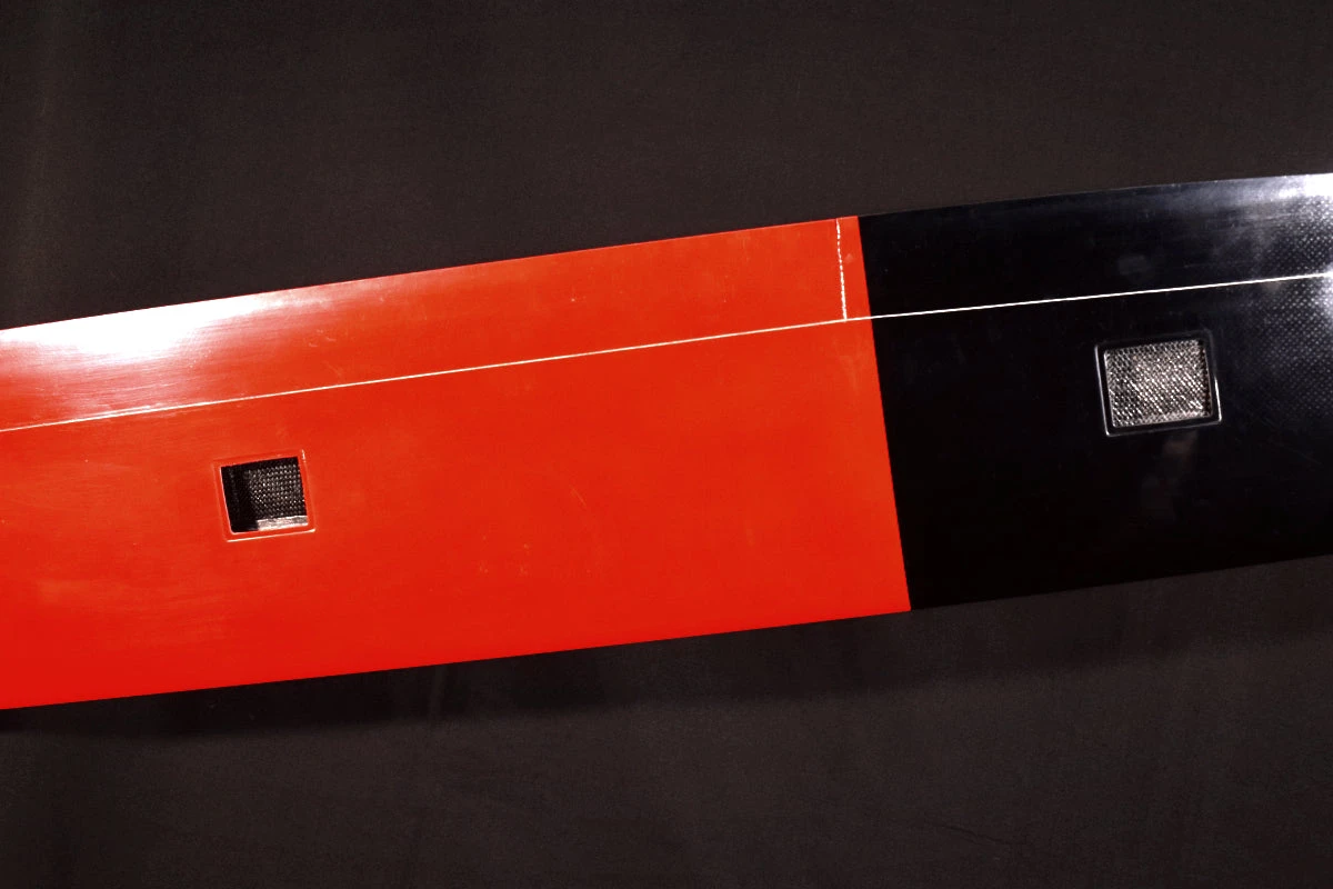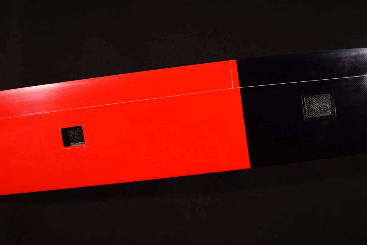 The bottom of the wing shows the four carbon reinforced servo pockets for the flap and ailerons. The contrast of the top and bottom color schemes are well apparent.