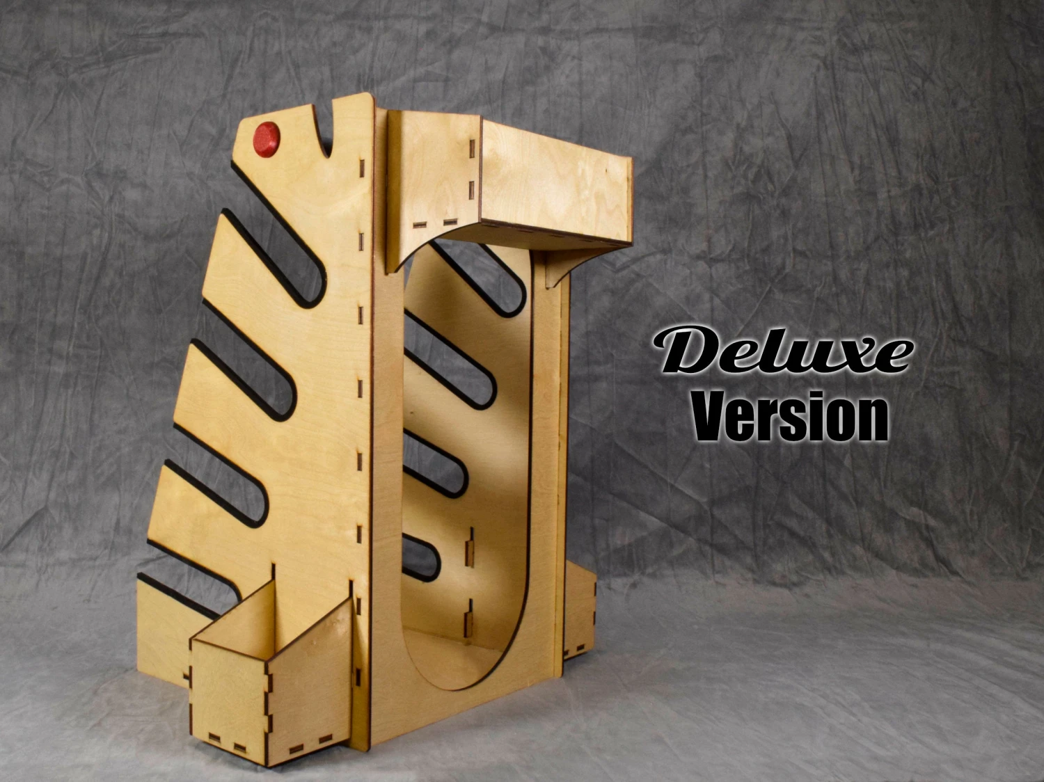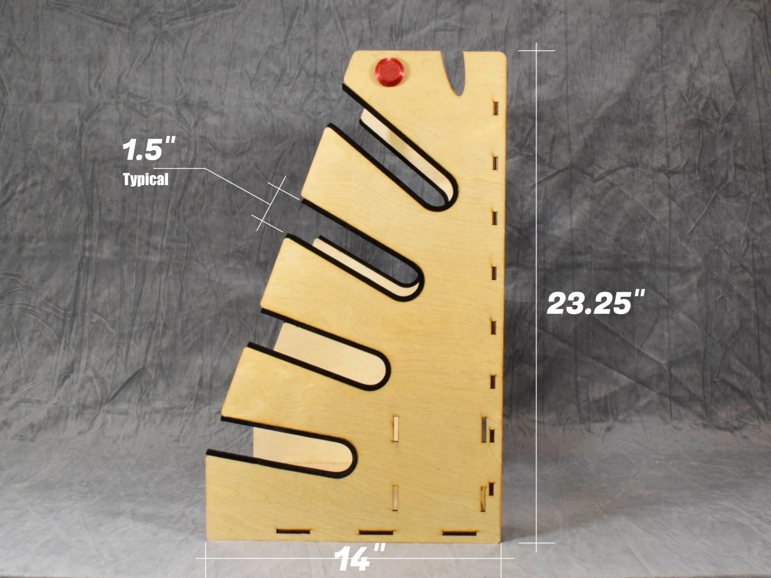The carrier is constructed of laser cut plywood, the handle which is made from very strong PVC pipe; and some 3D printed endcaps. A roll of squishy black closed cell foam tape is included to grip and cushion your models in the slots.