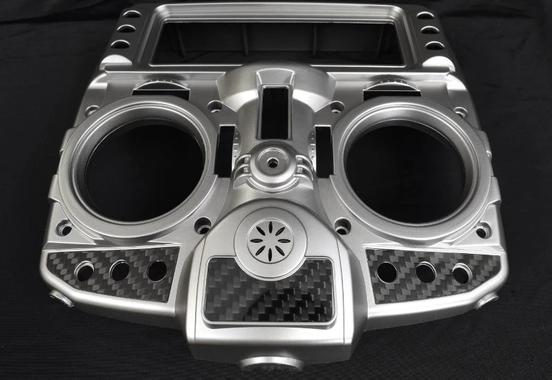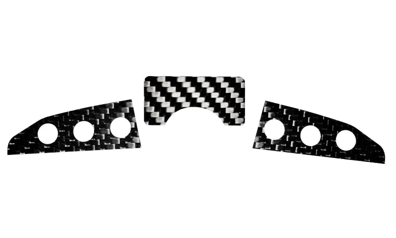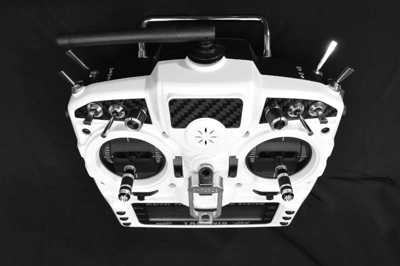 Made of 2X2 twill weave carbon and less than .010″ thick, these laser cut accent plates replace the switch-plate and logo stickers on the Taranis X9D’s. They are pretty snazzy looking with their slightly holographic effect.