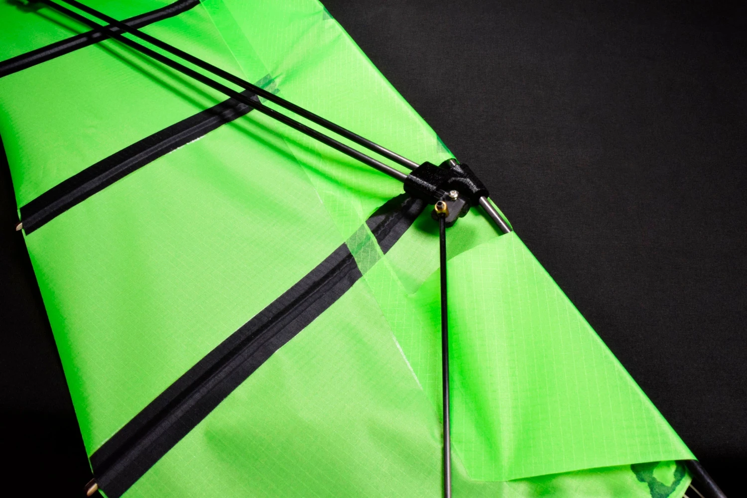 The lightweight and robust frame is mostly made from carbon fiber, that supports a colorful, high strength rip-stop fabric sail. The airfoil shape is provided by specially designed ply battens that don’t lose their shape. The fabric we utilize is an advanced material designed in the USA for sailboat spinnakers. The fabric and the frame design combines to make a VERY durable aircraft.