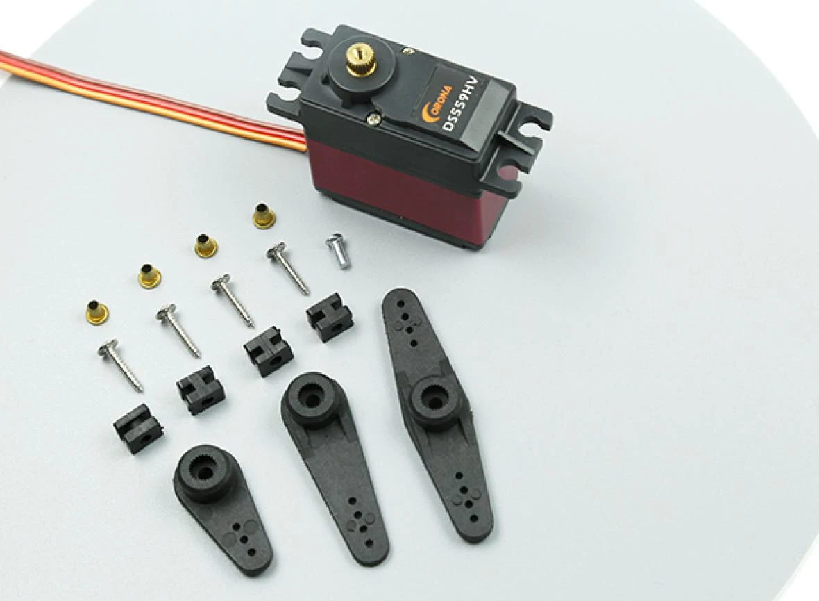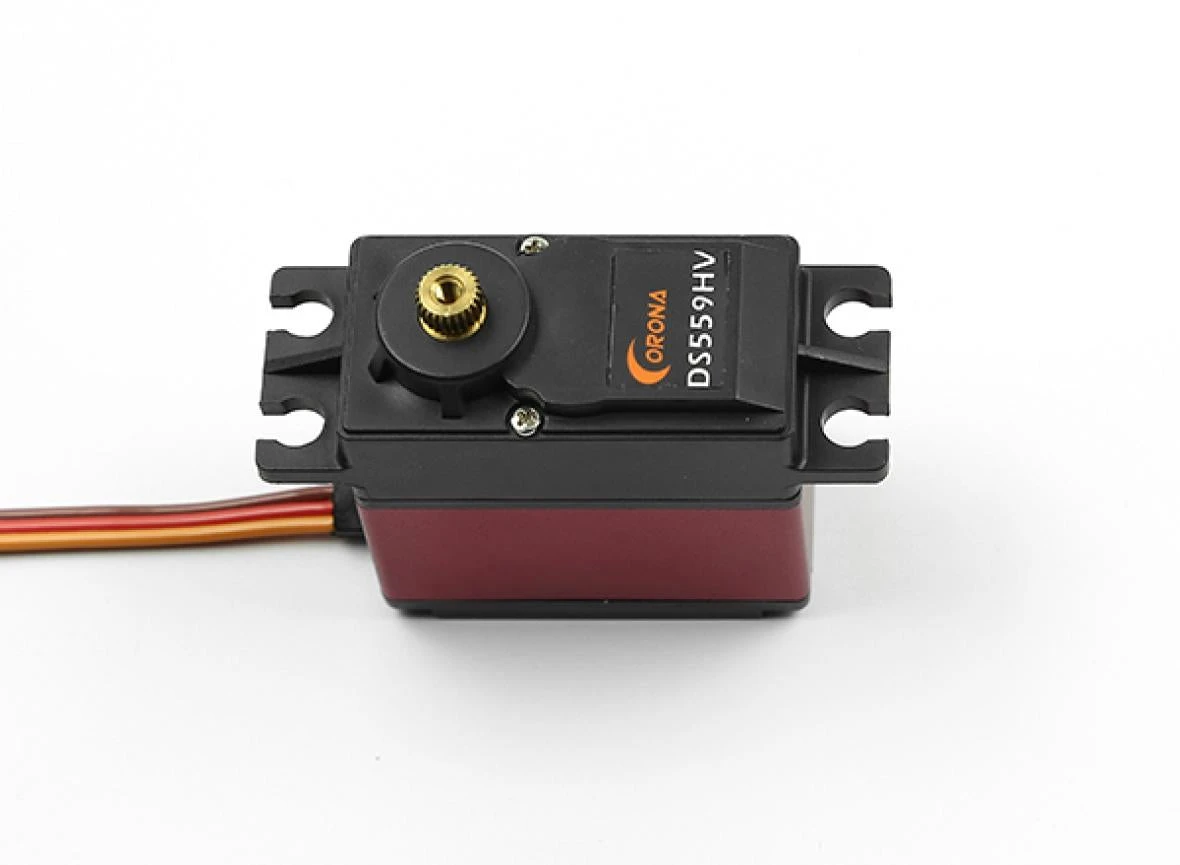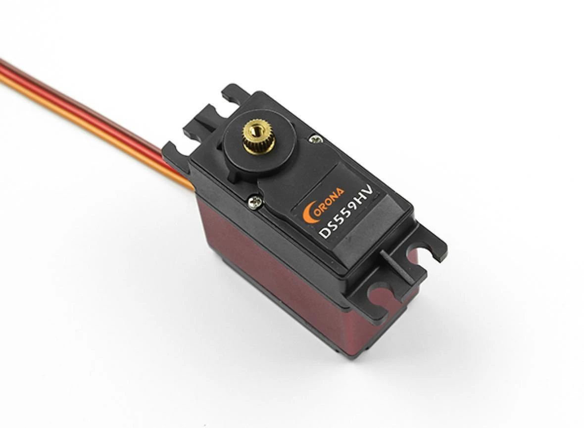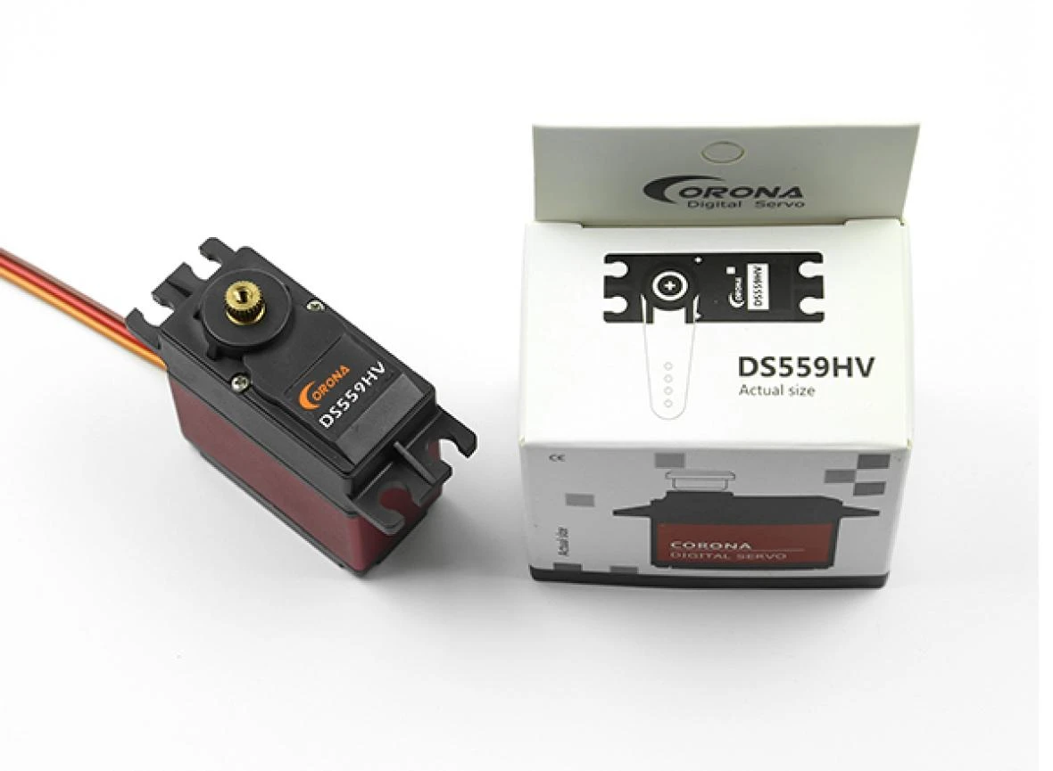 Corona presents the DS559HV, Digital, High Voltage Servo. This low price standard sized servo puts out up to 20kg and is good for when you need an inexpensive, high torque, standard sized metal gear servo.