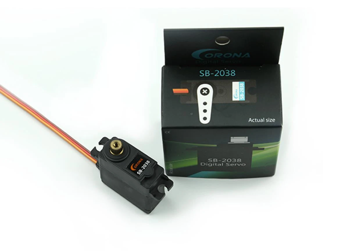 Corona presents the SB2038. This metal gear servo is has both good torque and speed. It can use both PWM as well as S-Bus signals and can be programmed using the Corona CSBP-1 SBUS Servo Programming card.
