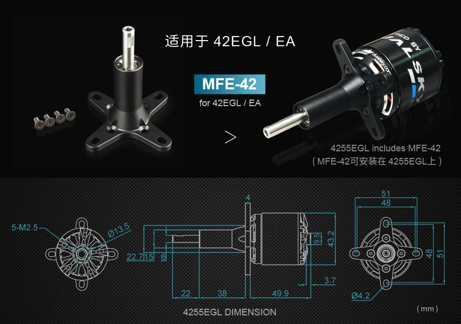 For the large scale motor glider market comes the MFE-42 motor shaft extension. The assembly bolts right onto your Dualsky 42EGL/EA or ECO 35 series motor so it will fit it in the nose of that scale glider you might be working on.