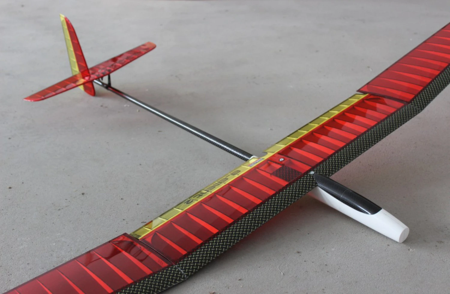 For the carbon D-Box a 3K hybrid carbon / aramid material of highest quality is used. The main spar is made of balsa, reinforced with carbon and covered with glass. Ultimately, it is wrapped in kevlar, giving it even greater strength combined with the hybrid D-Box. The trailing edge is made of carbon, and there are carbon cap strips on the upper and lower side of the ribs, which are reinforcing the whole construction. The flap is continuous across the whole span of the center-section and it has a built-in kevlar hinge.