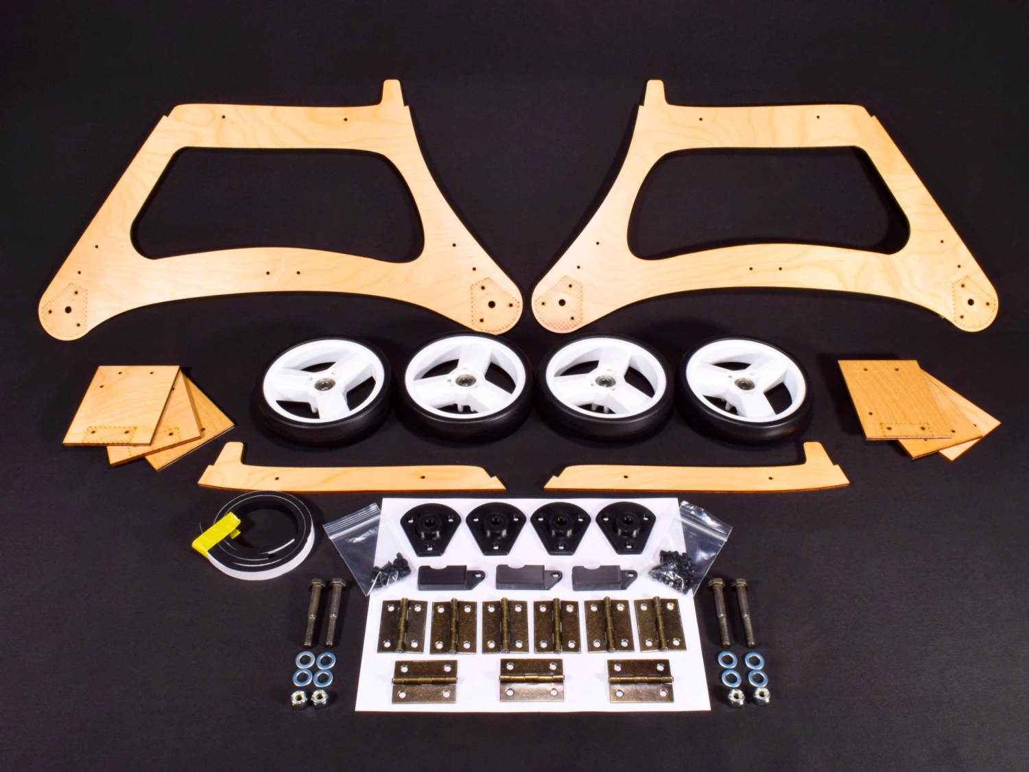 Includes a mix of laser cut pre finished birch plywood, 3D printed parts and steel hinges, closed cell foam, wheels with bearings, axle bolts and assorted hardware.