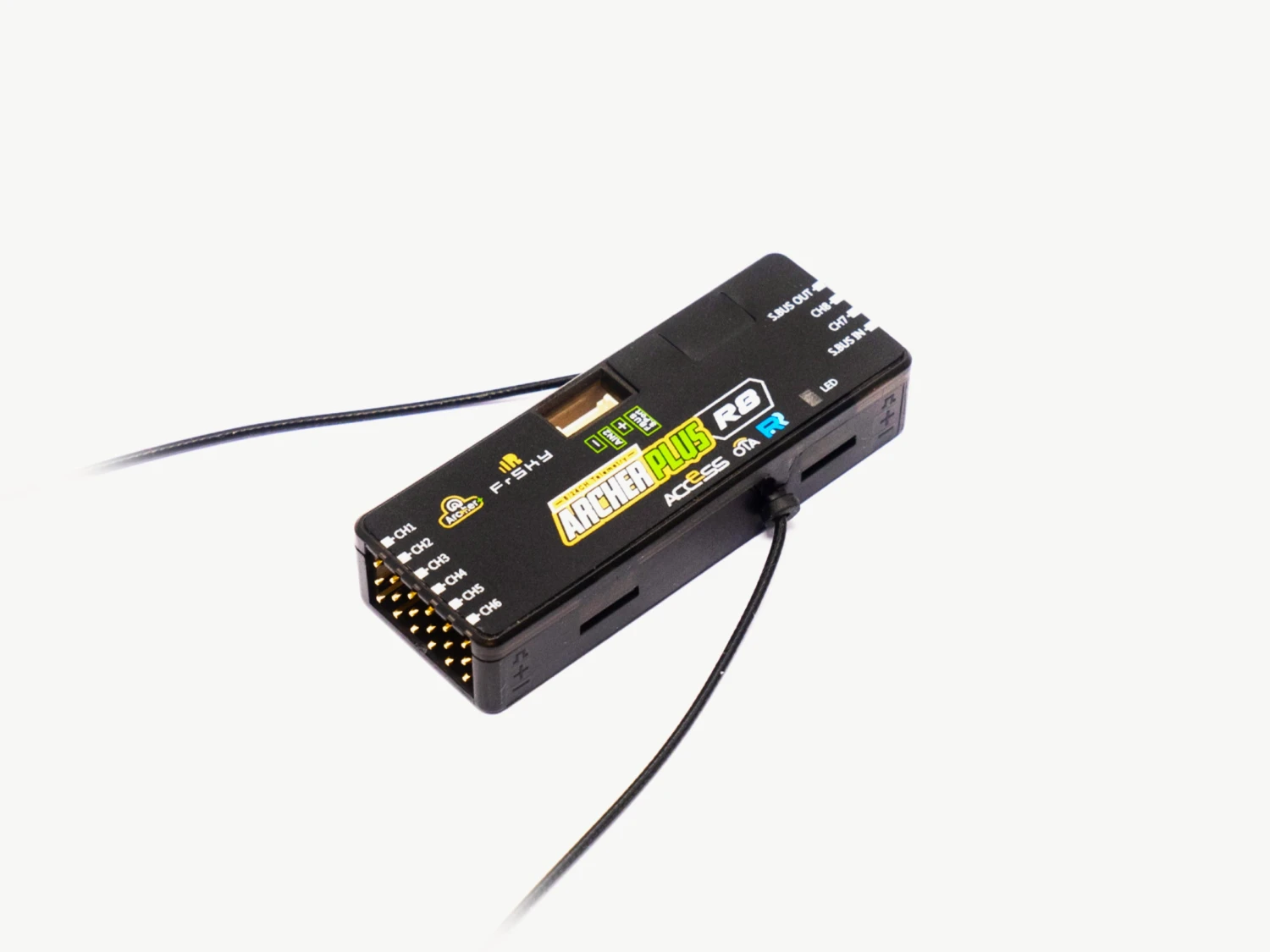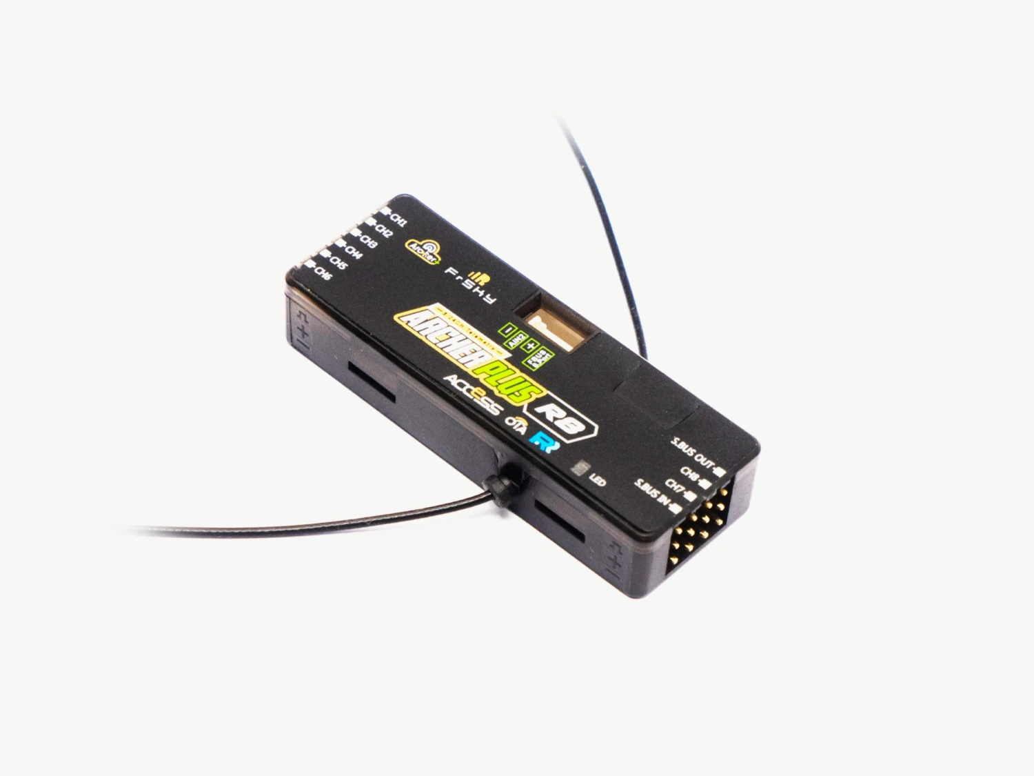 The Archer Plus R8 is the goto 8 channel receiver from FrSky. Like all Archer Plus receivers it is able to talk to most any FrSky transmitter or module as it supports both ACCST D16 and ACCESS protocols. It does this little magic automatically while binding. The R8 is now much thinner allowing a better fit in most any model!