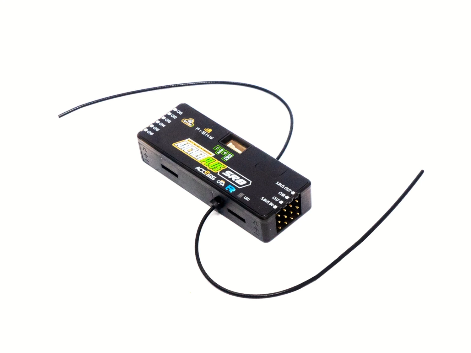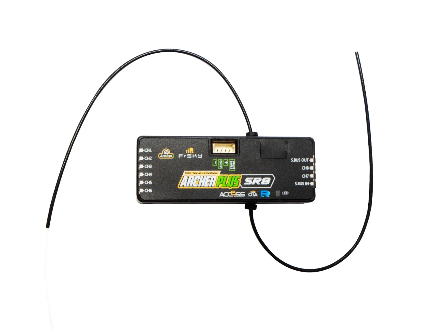 The Archer Plus SR8 are gyro-stabilized receivers with a built-in 3-axis gyroscope and 3-axis accelerometer and feature multiple flight modes (Auto-level, Stabilization, Knife-Edge, etc.) and configuration methods. These receivers support full-range signal strength with dual detachable antennas which guarantee optimal antenna reception and range. The Archer Plus SR8 can be used as a Primary receiver in a redundant system by wiring the SBUS In port and connecting to any other FrSky receiver equipped with an SBUS Out port. With the FBUS protocol, the Archer Plus series receivers can open up the possibility of seamlessly pairing with multiple telemetry devices (XACT servos, ADV Sensors, etc.) as well as simplifying the setup.