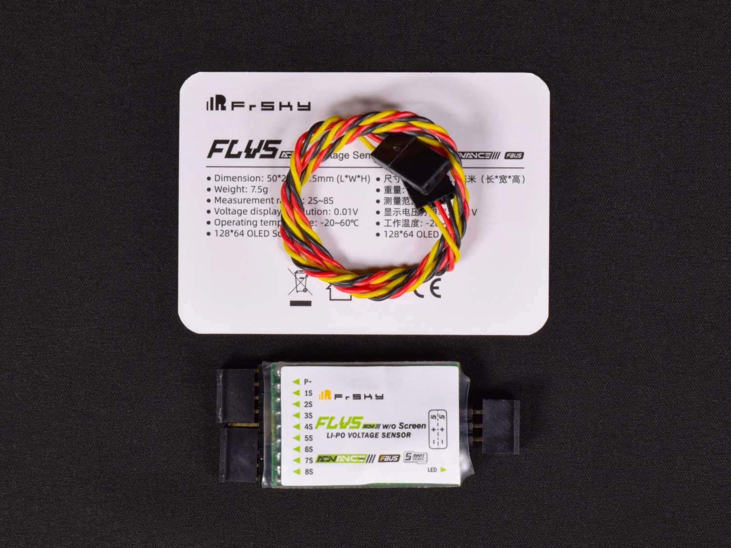 A FrSky FLVS ADV minus the OLED screen and a reconfigured circuit for a more compact design that has significantly reduced the size and weight. Great for those who have smaller, or weight critical aircraft. It works with All FrSky SmartPort capable receivers and provides Flight battery voltage telemetry, up to 8s LiPo but what’s new is F.port capability, allowing for even faster telemetry.