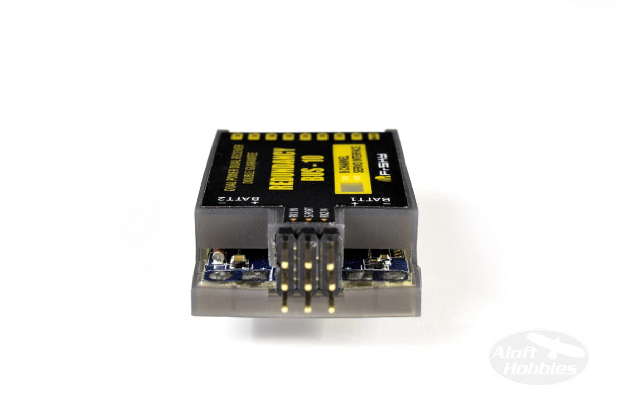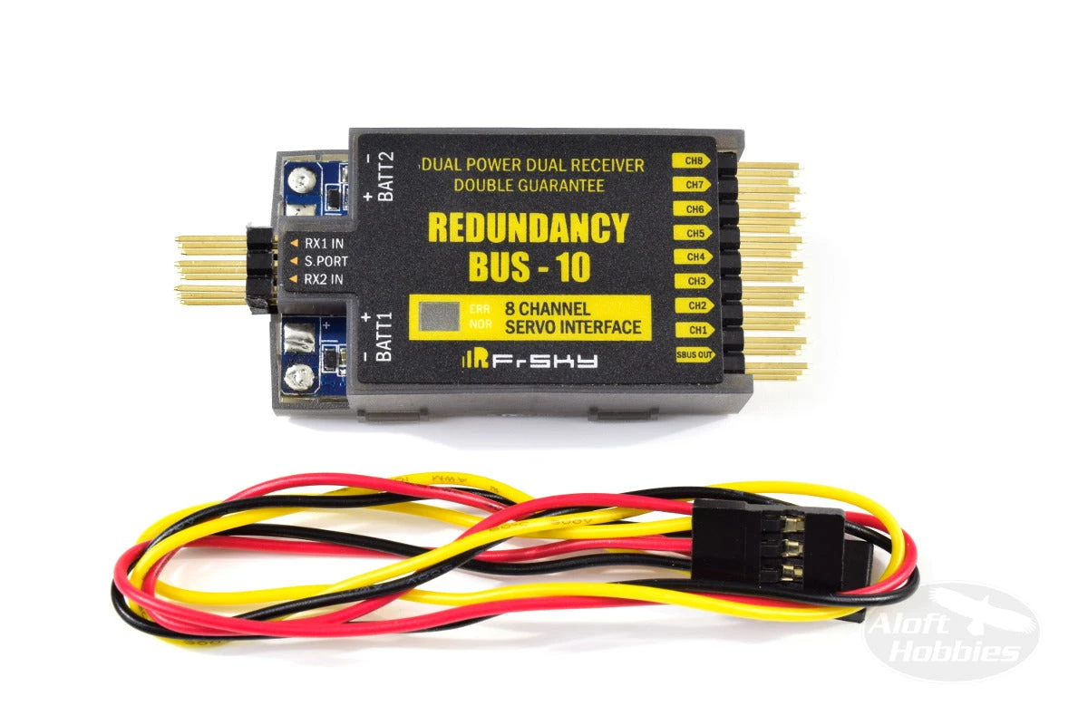 Building redundancy into our RC systems not only makes them safer but also helps to protect our investments. The FrSky Redundancy Bus-10 brings an added measure of insurance and reliability to the FrSky RC system. It gives us the ability to integrate dual receivers and dual power supplies into our control systems. The result is then, that the Redundancy Bus (RB-10) has a spare control signal and a spare power supply to rely upon in the event of a malfunction. The RB-10 also supports the S.Port telemetry system and its sensors as well as SBUS. Last but not least the RB-10 monitors all 8 servo output channels for overcurrent and overvoltage conditions, and will limit those outputs to protect your servos in the case something goes awry.
