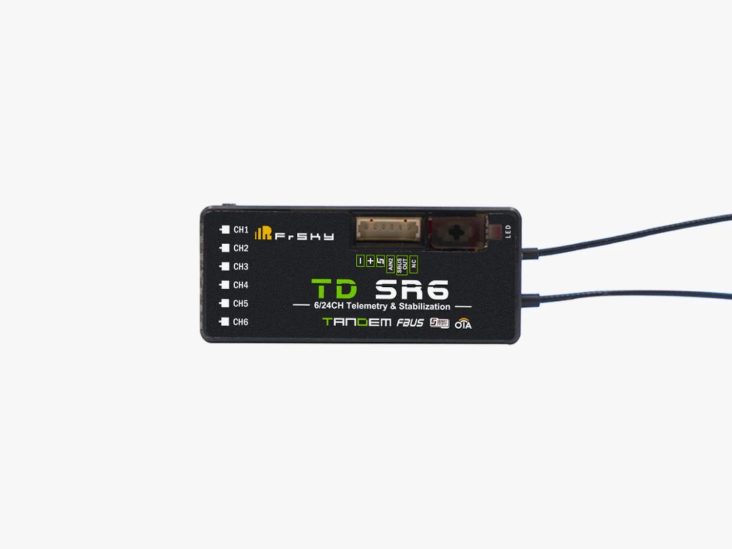 TD SR6 receiver offers 6 PWM channel outputs and is bundled in a compact lightweight design, the receiver also provides output pins accordingly for SBUS Out and FBUS/S.Port. By setting the S.Port to the FBUS protocol, the TD receivers can open up the possibility of seamlessly pairing with multiple telemetry devices (Neuron ESC, Advance Sensors, etc.) as well as simplifying the build setup.