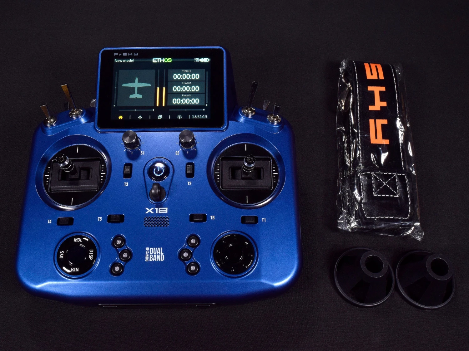The FrSky Tandem X18 is a dual-band telemetry radio that features a color touch screen display, ergonomic design, Tandem dual-band RF system (2.4 & 900), and most importantly Ethos – Frsky’s newest operating system. It boasts an impressive end-to-end latency, ergonomic design featuring low weight and a thin profile, natural switch, summary, and slider positioning, hall effect gimbals as well as built in mass storage.