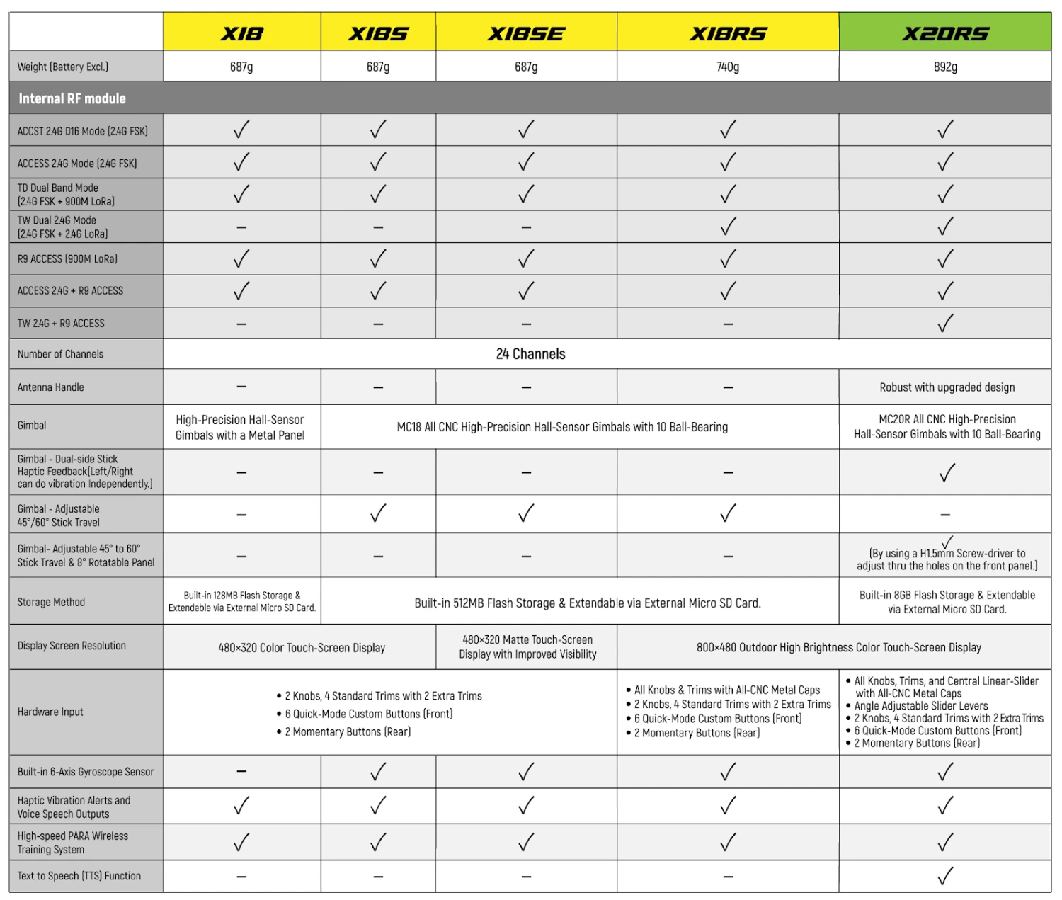 The latest in the popular Frsky X18 family of radios. The RS is the new top of the line for the X18 family. The main differences from the X18SE are the addition of the dual 2.4G TW RF mode (TWIN) along with all of the normal great TANDEM dual frequency options of the previous X18 radios, combined with the upgraded 800×480 resolution screen with great visibility under sunlight. Also some new colors. This puts it well on the same level as the X20RS, but with a little smaller form factor.