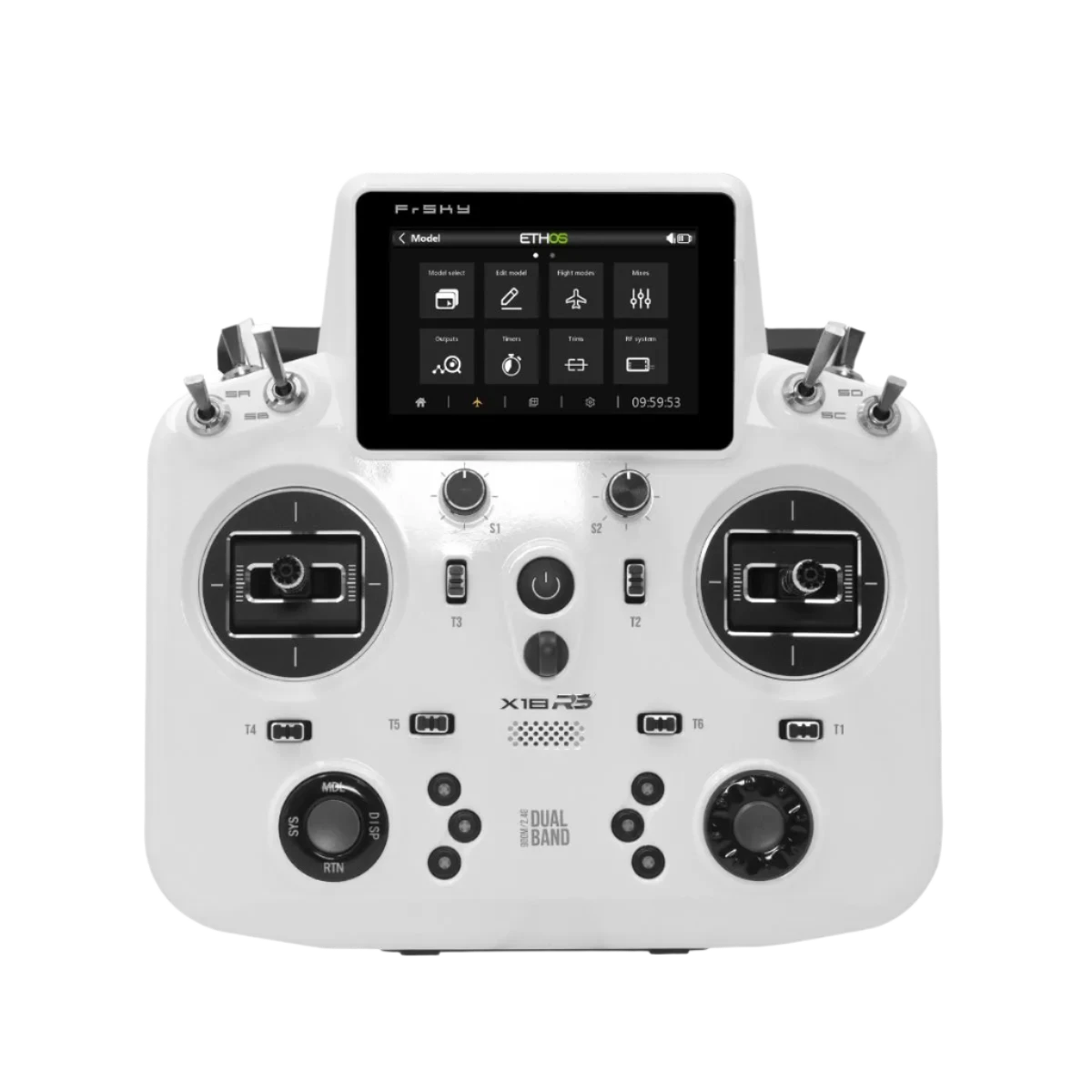The FrSky Tandem X18SE is a dual-band, FULL telemetry radio that features a color touch screen display, ergonomic design, Tandem dual-band RF system (2.4ghz & 900mhz), and most importantly Ethos – Frsky’s amazing operating system. It boasts an impressive end-to-end latency, ergonomic design featuring low weight and a thin profile, natural switch, summary, and slider positioning, hall effect gimbals as well as built in mass storage. More channels and mixes than you will know what to do with, but all very usable thanks to the friendly and powerful Ethos programming environment.