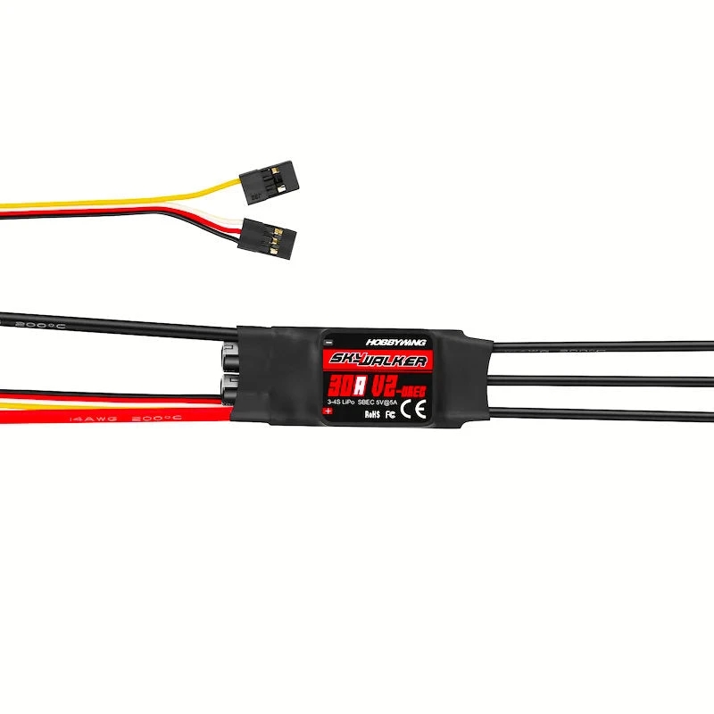 The Hobbywing Skywalker 30 Amp V2 motor speed control is economically priced and ideally suited for medium sized builds. It’s rated for a 3-4S Lipo, 30 amps constant and up to 50 amps burst (10s). Outstanding features include Active Freewheeling for better throttle response, cooler running at partial loads and better efficiency, a hefty 5A BEC as well as many parameters, which may be programmed with your throttle stick or with the HobbyWing ESC Programming card.