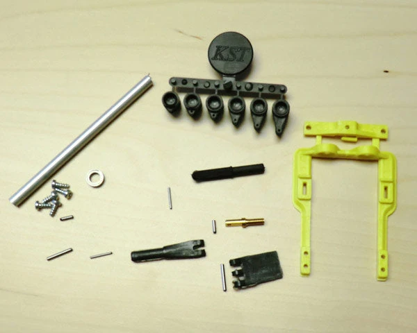 - Flip the servo over and install a servo arm and bearing, they just pop on.