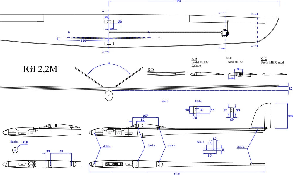 The Igi is one sweet glider! The slender 2.2 meter wing is elegant with live hinges for the ailerons and flaps, and a sleek fuse with plenty of room for a ballast tube. Happy in light lift or a riot in stiffer winds.