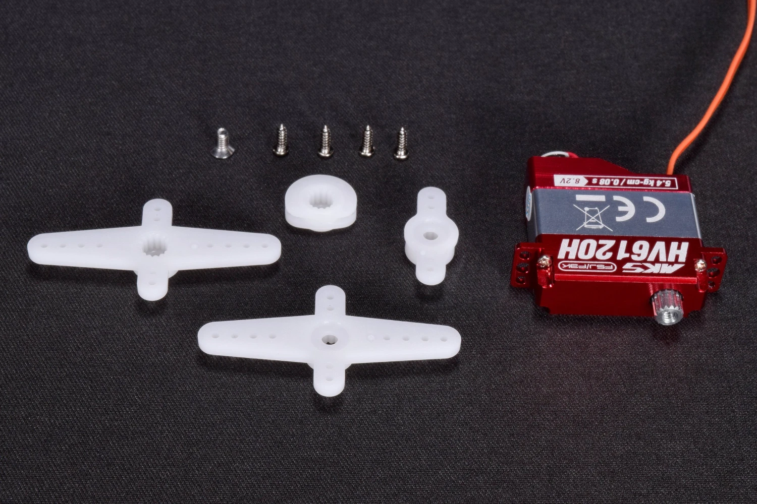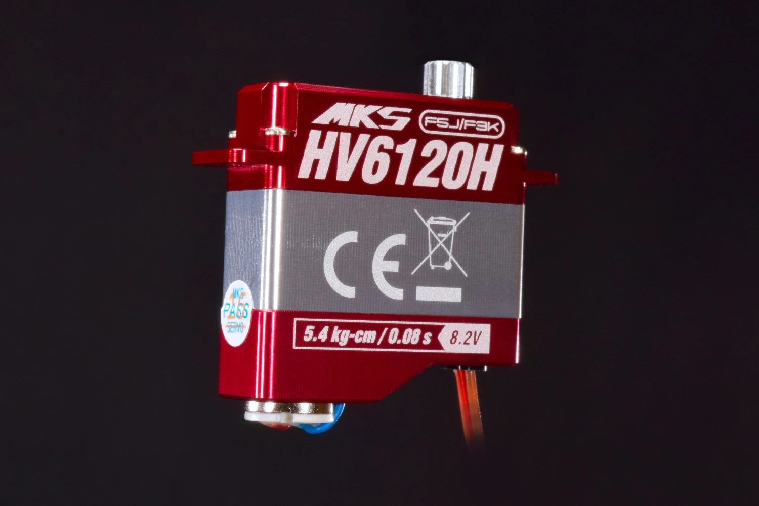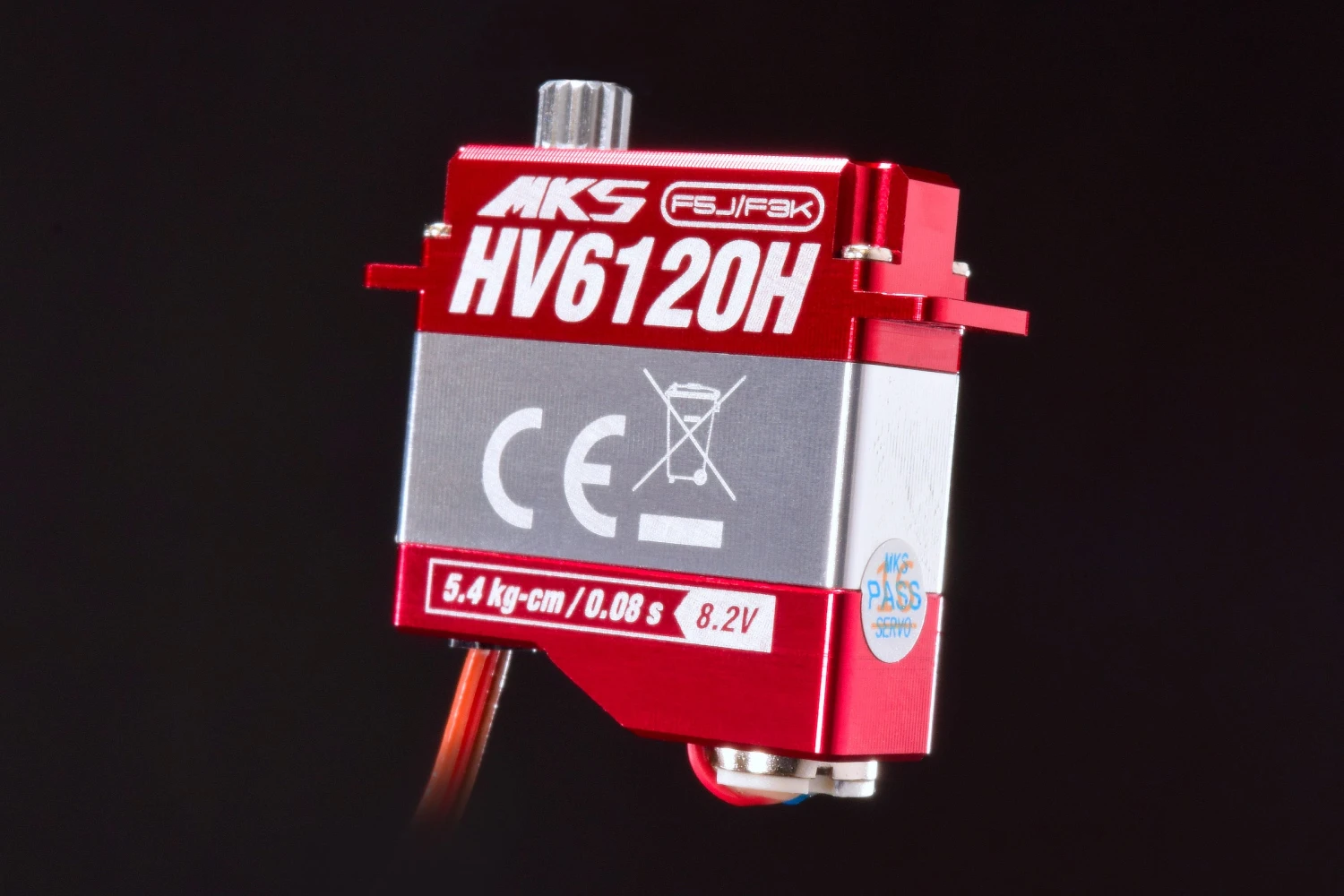 MKS presents the HV6130. Like all MKS servos, it utilizes quality components and ultra tight tolerances for superb resolution and holding torque. It features a wide voltage range, from 3.7 to 8.4v and at 8mm thick, it’s an excellent choice for use in F5J/F6K glider fuselages. 5.4kg of torque on 8.4v and a 0.008 transit time means these little servos will make short work of any application where you need a small, thin, high quality sub micro servo.