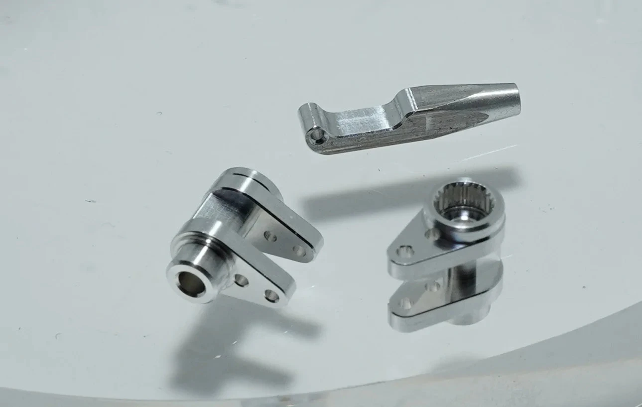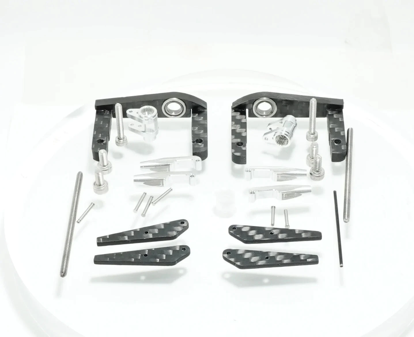 Studying the parts kit, you will find exceptionally well machined components; the CNC parts are beautiful, the anodizing is clean, resulting in a very good fit and finish. The kit is well thought out and very complete (some kits even include sand paper and super glue for assembly). You are given a choice for your pushrod assembly, you can use the included carbon rods to create exact length push rods or you can make adjustable length pushrods using the included threaded rod. The designer has proven that the carbon pushrod assembled using super glue can withstand 220lbs in tension. The servo frame parts are machined from 3.5mm thick carbon and the control horns are machined from 1.7mm carbon. Beefy stuff.
