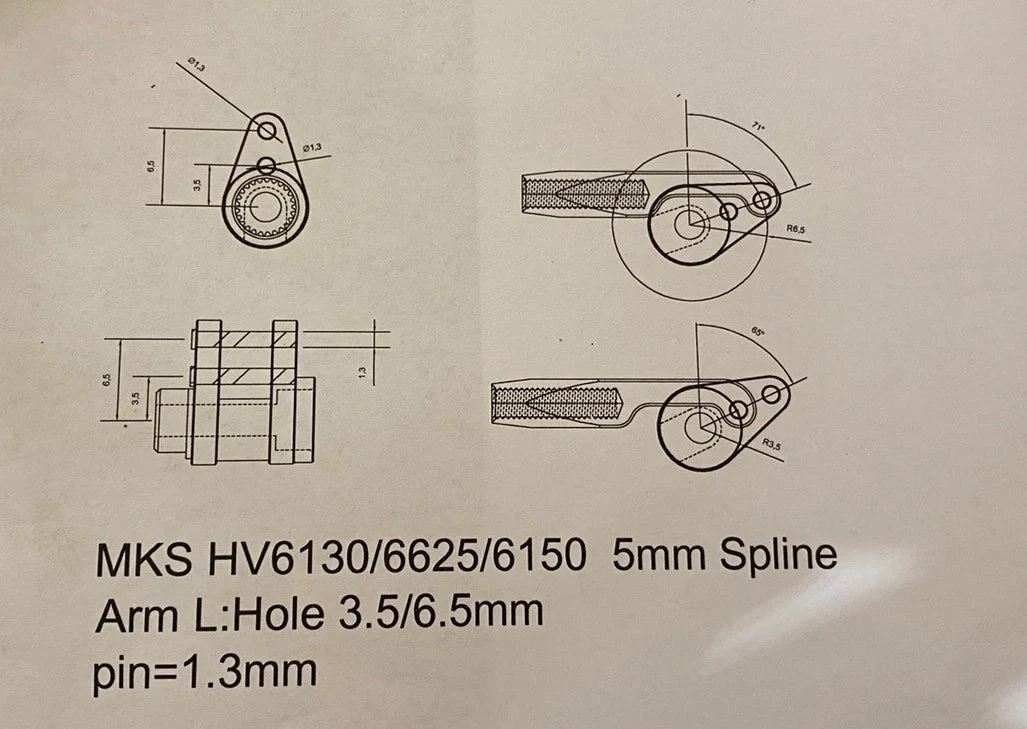 Note: The servo horns have two drive holes. One at 3.5mm and one at 6.5mm from the center of the the servo drive shaft.