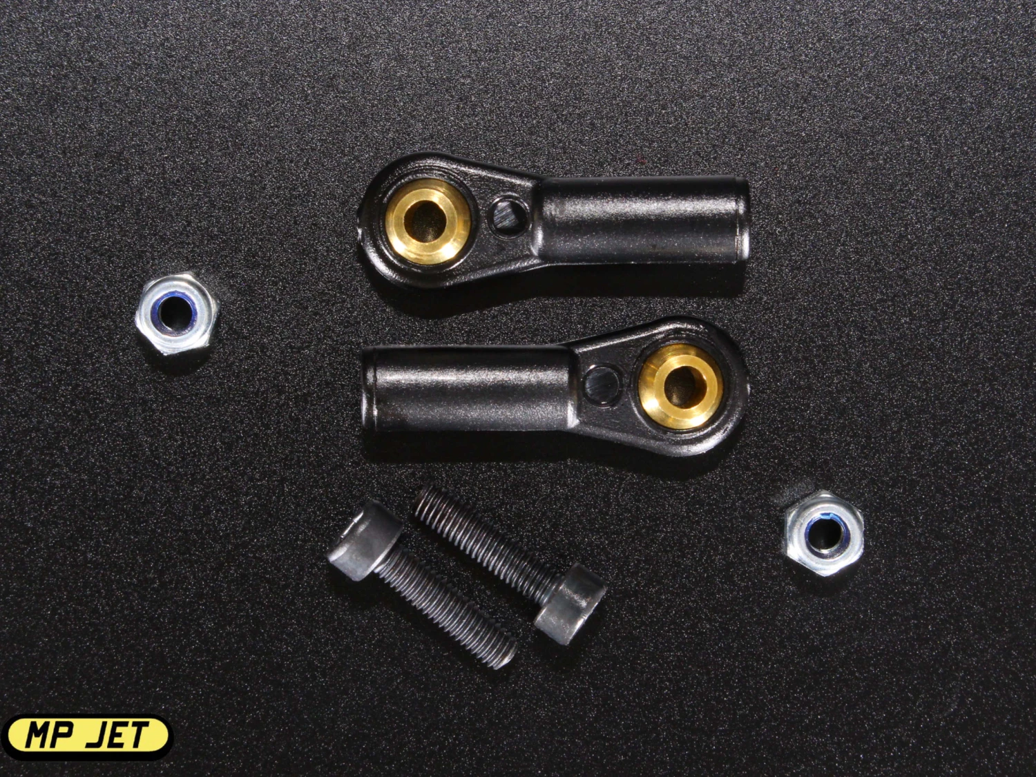 MP Jet Ball Link V1 has plastic body with a brass 7mm ball that has a 3mm hole through the center. The ball allows bind free push rod movement at all angles.