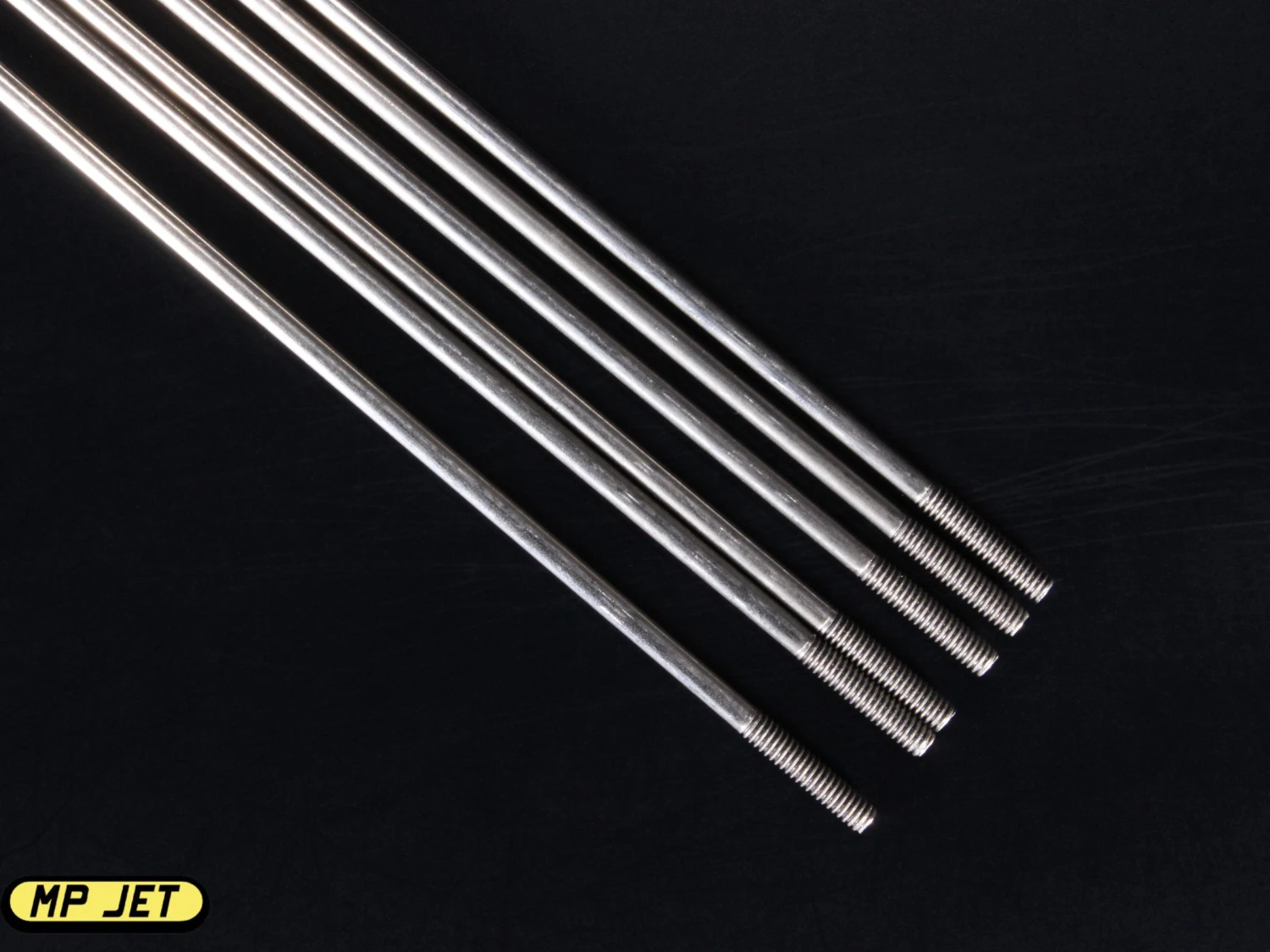 MP Jet tempered stainless steel push rods. 2mm diameter and 290mm long with a M2.3 thread on one end.