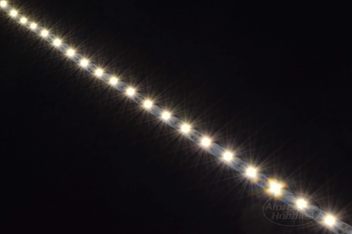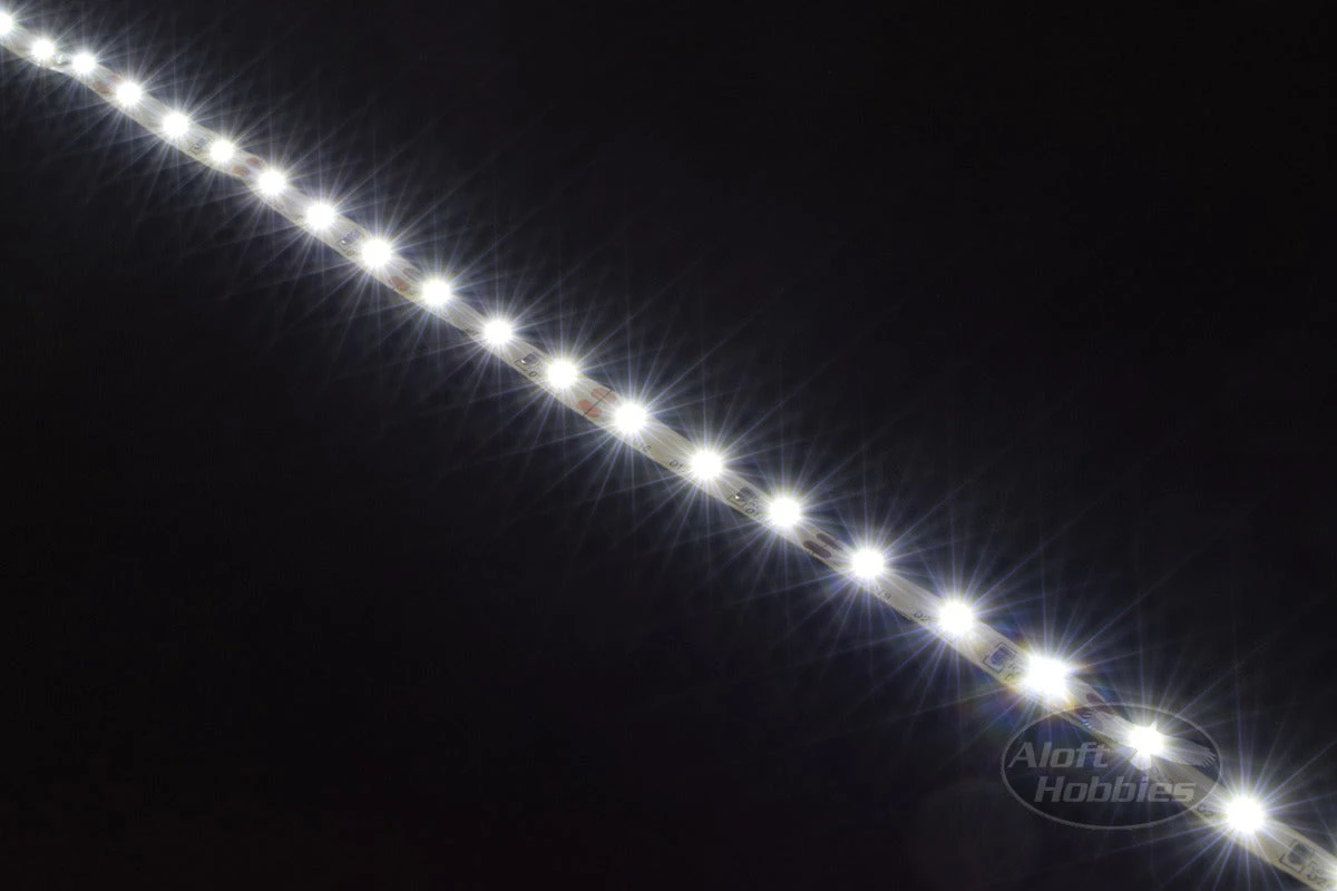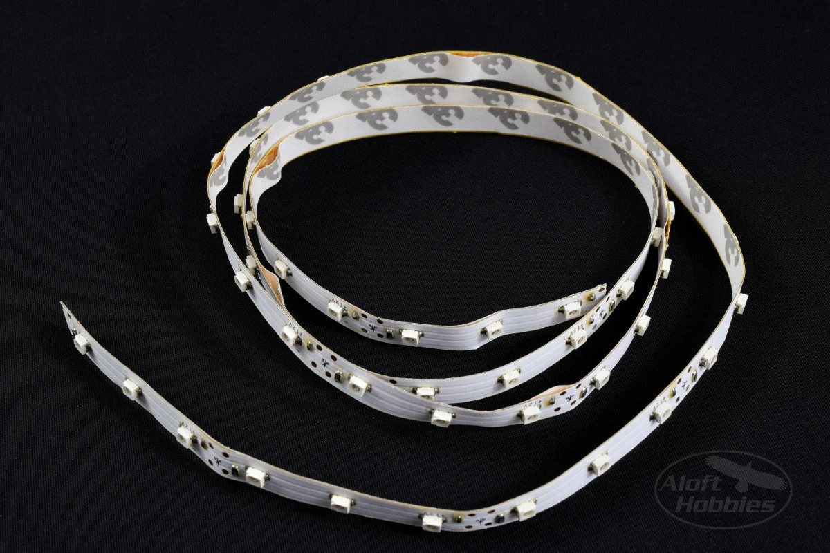 Add colorful illumination to your aircraft with our 1 meter LED strips. The strips are designed for 12 volt operation and can be cut apart or soldered together every few inches (Look for the scissor symbol that is surrounded by 4 solder pads). The LED’s are mounted to a flexible tape containing copper traces that conduct the power. The backside of the strip comes with 3M sticky tape, sooo peel away and apply!