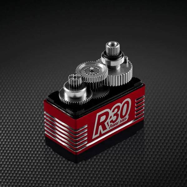 One of the advantages of coreless motors is their ability to change direction very quickly, due to the low rotational mass of their armatures. The motor spins titanium and steel gears that are supported by bronze bushings and dual ball bearings on the output. The main body of the servo is machined from aluminum and houses the motor, potentiometer and digital decoder / ESC board.