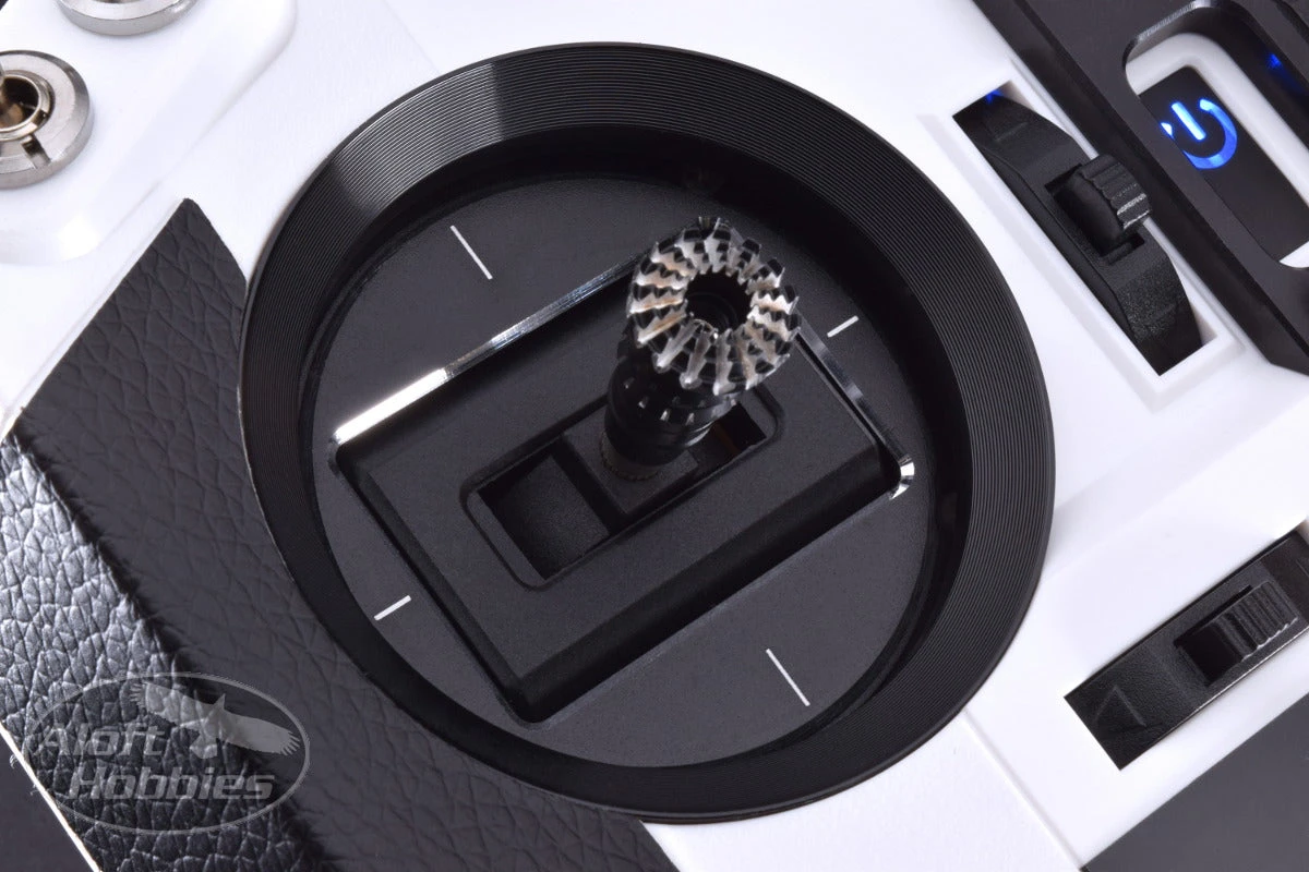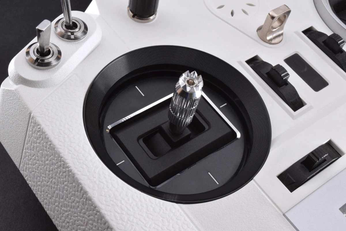 Kit installation is straightforward; after removing the stock gimbals pop out the silver plastic gimbal bezels and insert the aluminum rings in their place. Next insert the plastic spacers on top of the bezels, then center the gimbal in the spacer. Finish installing your M7 gimbals and your done! Easy peasy…..