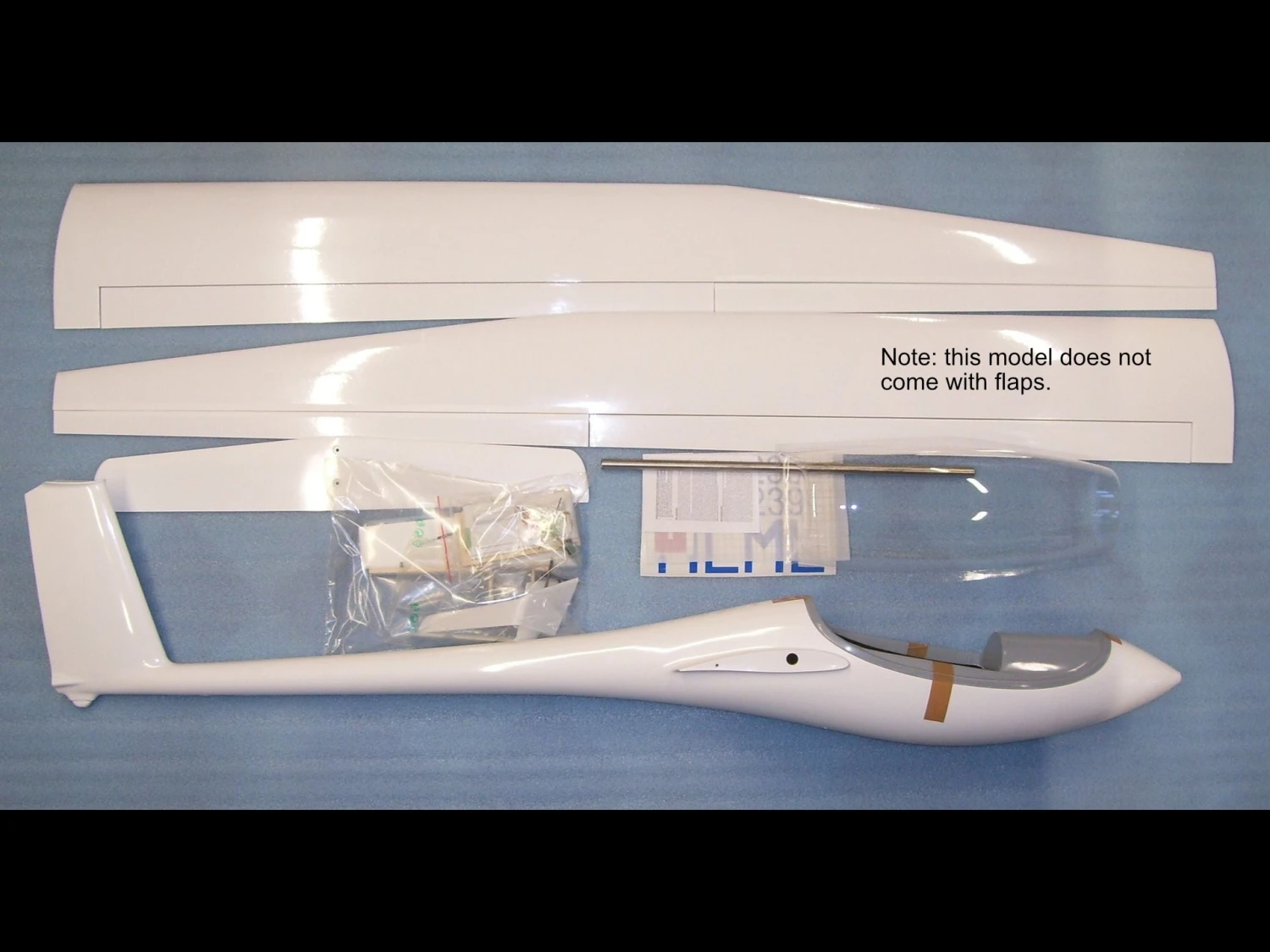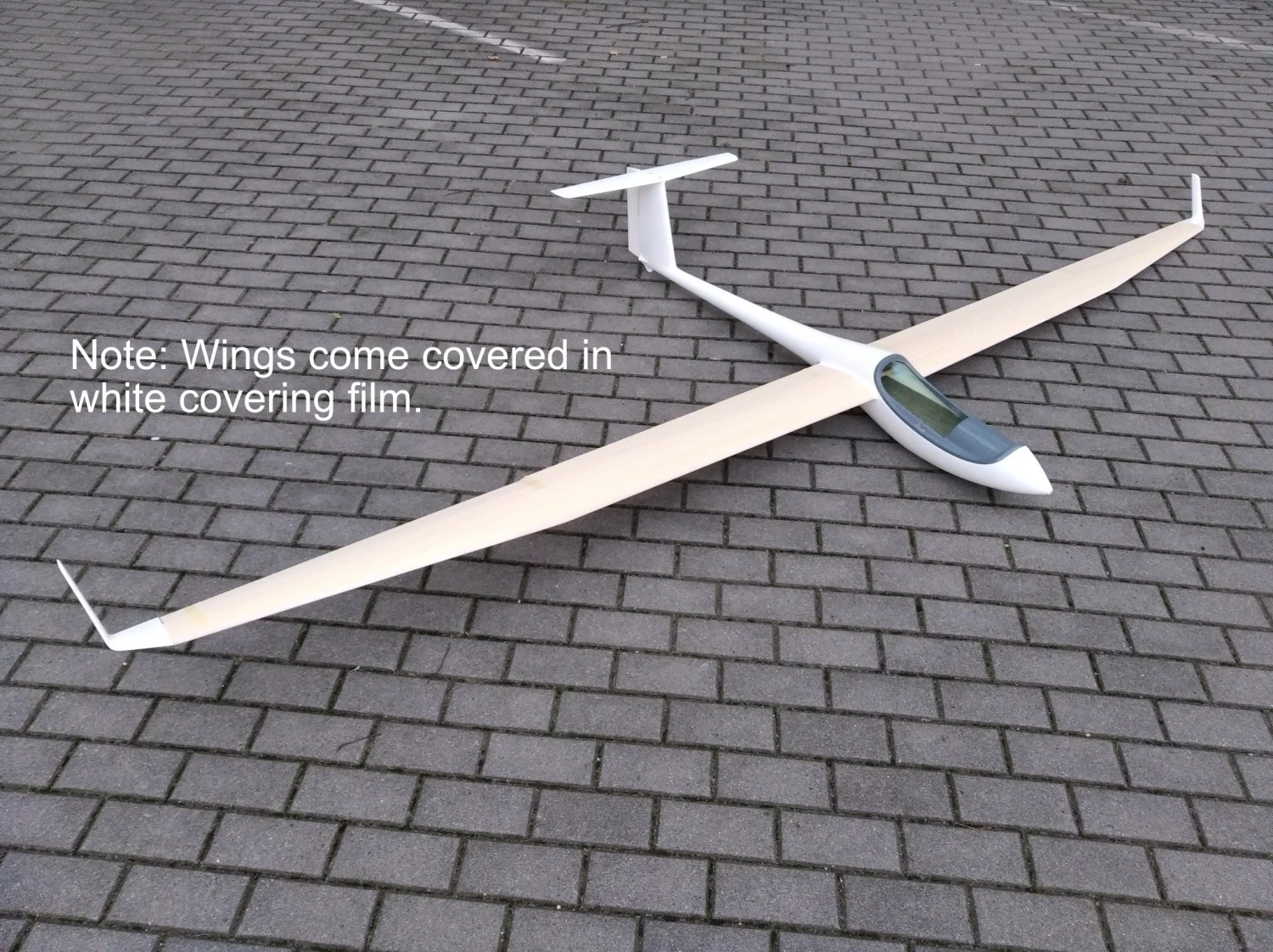 The wings are wood sheeted foam with covering with ailerons and fiberglass winglets. The fuselage is epoxy and glass composite with a white gel-coat surface. Precut, individual plywood servo frames are provided for the rudder and the horizontal stabilizer.