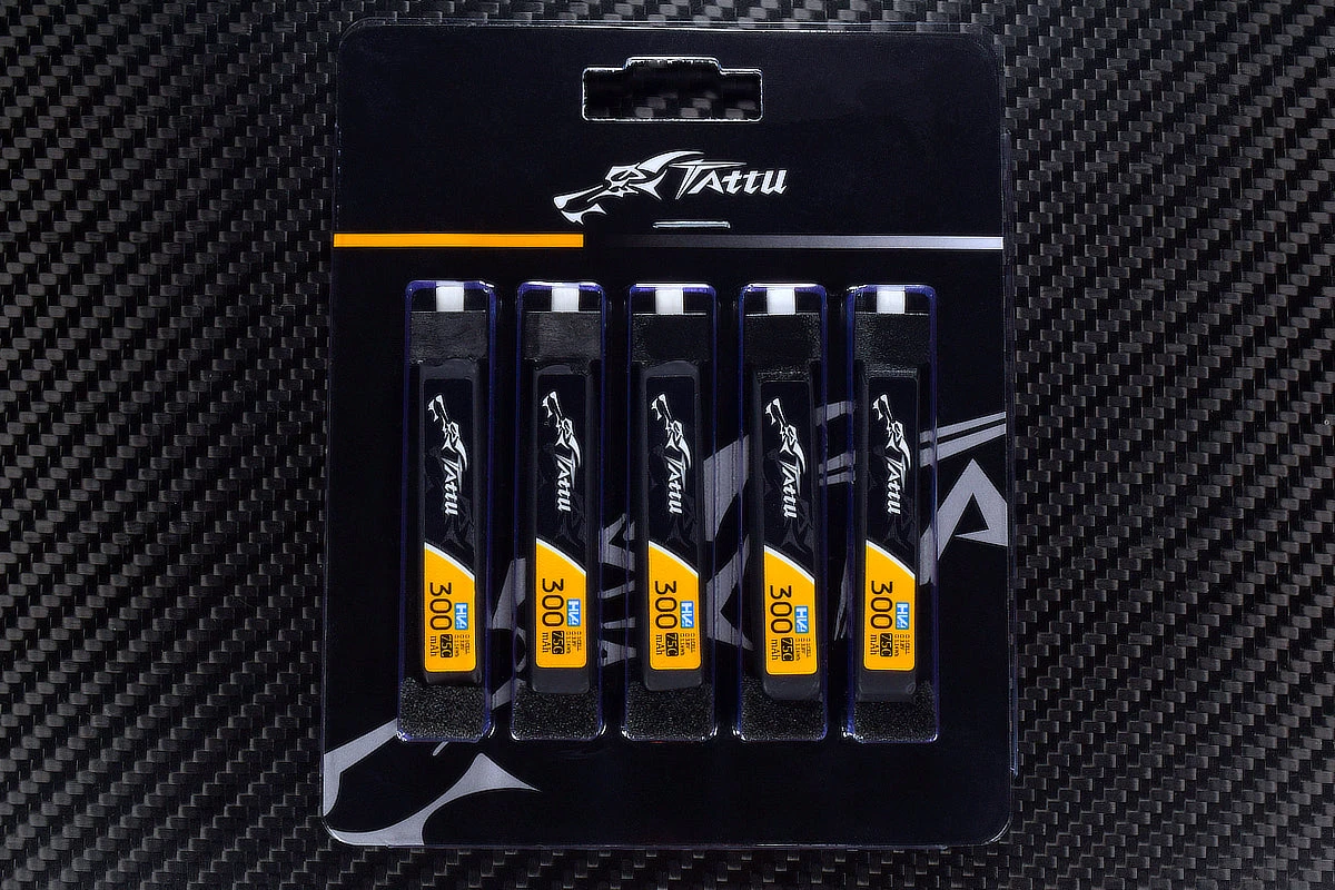 A solid battery for powering small FPV quads or other micro R/C aircraft. 5-pack. Designed specifically for the UAV / UAS market, Tattu batteries have been designed to a higher tolerance level than your typical hobby grade battery. If you are looking for a lightweight reliable battery to power your latest creation, the Tattu series of batteries will work well for you. A solid performing battery at a great price. Sold as a 5 pack. Specs: Dimensions 67x12x6mm Weight 8.2g Nominal Voltage 3.8v Capacity 300mAh Charge Rate 0.3A (1C) Discharge Rate 75C Max Burst Discharge Rate 150C Cell Type LiHV Number of Cells 1s Plug Type BT2.0