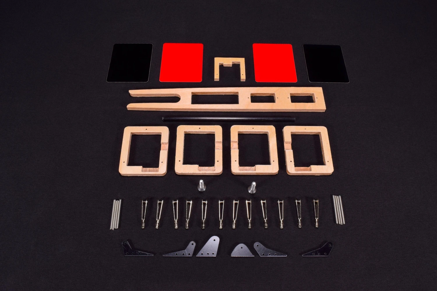 The hardware pack for finishing the plane contains all control surface hardware. CNC’d plywood servo and fuselage tray, carbon control horns and the screws for attaching the horizontal stabilizer (see pics).