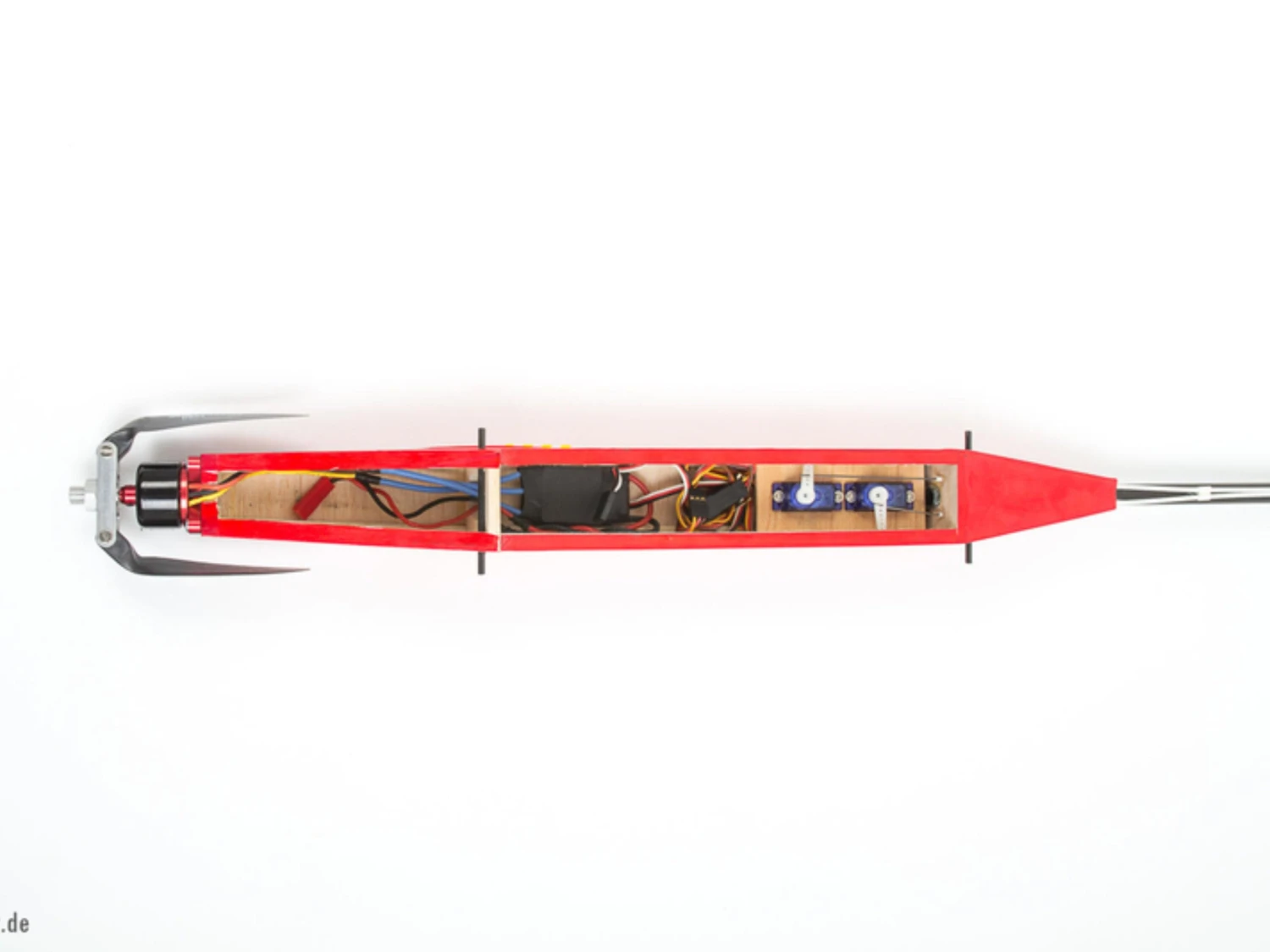 The rear fuselage consists of a single carbon fiber tube, which ensures a lightweight construction of the entire model. The empennage is firmly glued to the fuselage and cannot be removed, which is not necessary given the compact size.