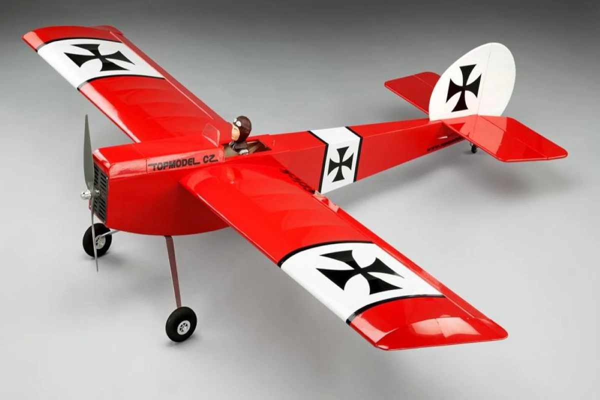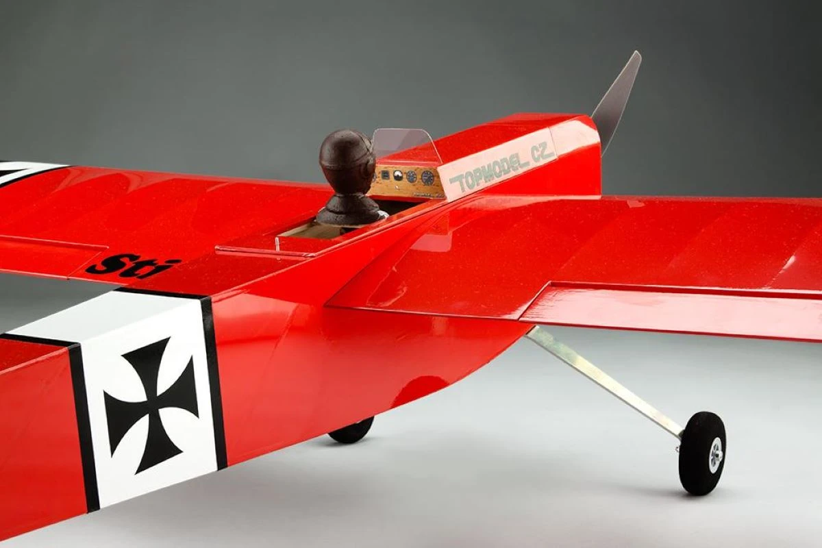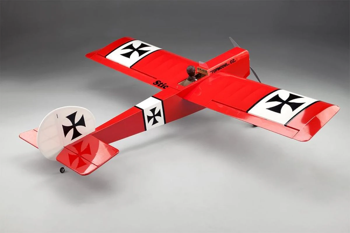 Influenced by the design of the popular “Das Ugly Stik” comes the TopModel Stick 1.6 meter electric sport trainer ARF. Featuring all wood construction, all parts are prefabricated to TopModel’s gold standard of quality and are covered with Oracoat in a WW1 Red Baron color scheme without a single wrinkle or warp.