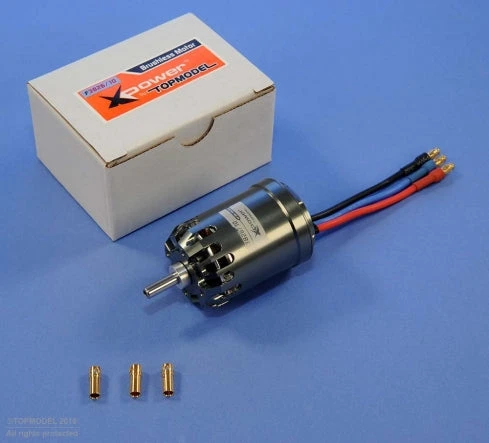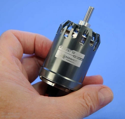 The Top Model XPower F3826/10 is just like any other “Outrunner” brushless motor, except the otherwise exposed rotating bell housing is housed in a can, just like an “Inrunner” motor. Thus making it a “Canned Outrunner’ motor. The main advantage is not having to worry about the motor leads getting caught in the bell, which really isn’t good at all. Another advantage is that they can fit in narrower fuselages, as the motor wires come straight out of the rear.