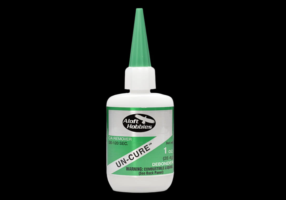 UN-CURE™ debonder will soften cured CA. If parts are bonded incorrectly or your fingers are stuck together, a few drops of UN-CURE™ will dissolve the CA in about a minute. Apply on bonded skin and roll apart fingers. Once unstuck, use acetone to clean off softened CA, then wash off with soap and water. Since cured CA is essentially acrylic plastic, anything that will dissolve CA will also soften most plastics. Care must be used, therefore, when using Un-Cure on plastics. Separating plastics parts with a razor saw is usually the best option.